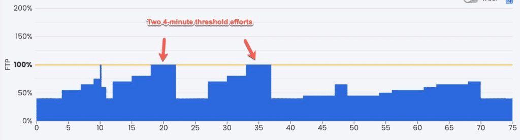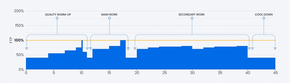 The main work is considered the focus of the workout. Even though you spend little time at threshold (100% of FTP) in this workout, it is still the primary adaption focus.